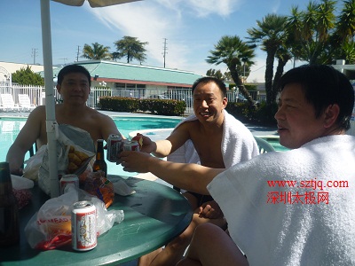 本次陈氏太极拳论坛所住的酒店KNIGHTS INN 环境优雅,设施齐全,虽然楼层只有三层高,立于前檐可以看到对面山顶洁白入云,绵延无边的雪山和风景秀丽的别墅区,楼下是一个游泳池和一泓湛蓝的水,池的北边是一家矮矮白墙蓝瓦平顶的西餐厅及一家轮胎专卖店,南边是一个小型停车场,稀疏停放了几辆汽车。