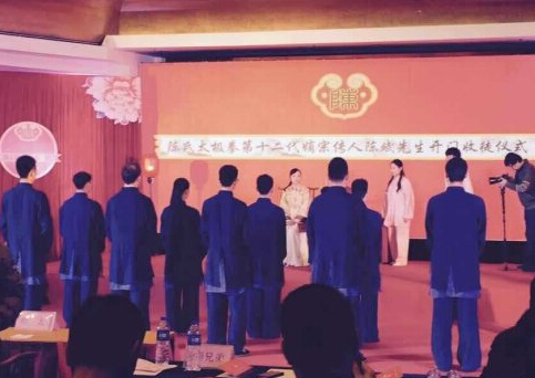 (中国体坛网讯)2015年元月11日陈氏太极拳第十二代嫡宗传人,四大金刚陈正雷之子陈斌开山收徒。从参加活动陈氏同门弟子微信照片上看,共有10人拜在陈少帅名下,其中还有一名外国友人。陈斌身穿一身红色袍子,很有师者风“范”儿。众弟子统一太极服饰,凸显精气神。整个活动古朴,高雅,有序,太极元素处处体现,整个活动给人感觉“高大上”,很有档次。少帅首次收徒弟消息也紧守不传,从百度等网站搜索不到,但还是通过微信传播引起武林界,太极拳届的广泛关注。