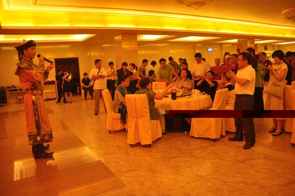 首先来自伊朗的ABBAS HAMZAVI代表外宾唱了一首伊朗民歌。国内的学员也也不甘落后,来自内蒙古的年轻帅小伙为大家献上一曲祝酒歌,还为陈大师和师母送上了哈达,表示多陈大师的祝福。来自郑州的程忠志送上了一曲“妹妹你大胆的往前走”,这首歌曲将晚会推到了一个小高潮,这首脍炙人口的经典老歌勾起了全场的回忆,引起了共鸣,大家都不约而同的唱了起来!来自黑龙江的学员临时自编自导自演的小品更是把大家逗的前仰后合。陈老师的一首老怀邦唱的非常有味道,大家都拍手叫好。随后应大家强烈要求,陈大师与夫人跳起了交际舞,更是将整场晚会推向了高潮。