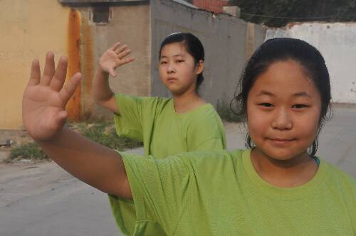 列队操练,幸好这个动作是个定步的动作,不然这么挤的场地,真不知道要怎么才能耍的开呢?定步的动作练起来,真的是腿痛。陈娟教练讲起了自己小时候练拳的往事: