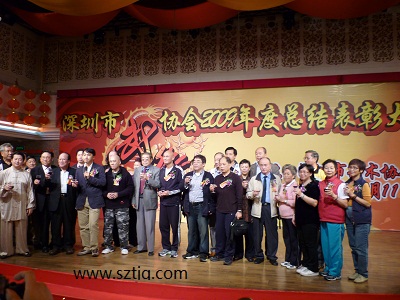 今天上午深圳市武术协会在银湖度假中心宴会厅隆重举行了2009年度先进集体及先进个人表彰大会,与会的嘉宾有深圳市武术协会的元老马志九、李斌副主席、陈勋副主席、李慈成秘书长及香港精武会的主席、深港两地的武术领军人物和武术爱好者近千人,在一片锣鼓声中太极拳表演开始,仍然先以国标太极拳开场,他们舒缓着健康的身体,漫步在霓虹灯下,霎时柔和轻盈;少林武术一进场就迎来了热烈的掌声,看那些小伙子各个身法矫健,时而腾空跃起,时而一掠丈许远,时而铿锵顿足,真让人看的眼花缭乱。最经典的就是今天请到的“腾格尔”唱响了整个宴会各个角落,身边的人问:是真的腾格尔吗?一曲《蒙古人》结束后,李斌副主席即兴有邀请“腾格尔”在为大家各唱一曲,在重武术爱好者的一片“再来一个”的邀请下,“腾格尔”又唱了《天堂》,二曲歌罢,众武术爱好者还是意犹未尽,三请“腾格尔”有高歌一曲,咦!真能以假乱真呢!最后是各先进单位和先进个人领奖仪式。首先公布的是:深圳市武术协会太极拳研究会、深圳市武术协会陈氏太极拳辅导中心(深圳市陈氏太极拳养生馆暨陈家沟太极拳馆深圳分管)、、、、、、;接着是先进个人:深圳市武术协会陈氏太极拳辅导中心教练马晓聪、、、、、、