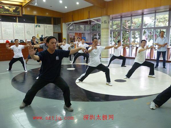 下午3点,拳馆内就聚集了几十位拳友,在余天宇教练的带领下,一边练习基本功,一边等陈斌老师的到来。陈老师到来后,先看大家打了一遍精要十八式,根据大家的问题讲解了陈氏太极拳对周身各部位的要求。这是个老生常谈的问题,也是大家出现问题最多地方。在练拳时要求全身放松,屈膝松垮,虚领顶劲,松肩沉肘,含胸拔背等,这些词在平时上课或书上是经常听到看到的,但在自己练习时就不行了。要想进入太极门庭,松胯是最主要的,每一招一式都屈膝松垮,开步和收步时,上半身要求放松中正。手臂的放松在初级时很大一段时间要求用意念来要求放松,以身领手。如刚刚大家练习中的懒扎衣,很多拳友肘高过肩;在开步时身体向一边倾斜或是弯腰;在收腿时身体也是倾斜;这都是违背了练拳的要求。练拳时身体左右倾斜主要是腿上功力不够,要想腿上有劲,就要多站浑元桩。在站桩时分三步:一、调整身体,从头到脚把每一个要求过一遍,是或周身放松;二、配合呼吸,要求自然呼吸,随着练功的深入逐渐加深,加长;三、加上意念,练功是,思想集中在丹田,意念要轻,不可紧张死守。