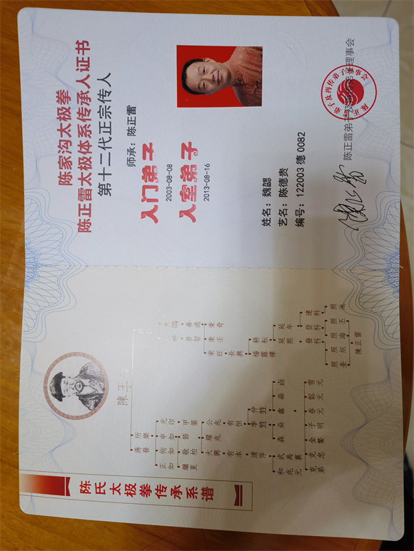 (2025年陈正雷宗师亲自给魏勰颁发传承人证书)
