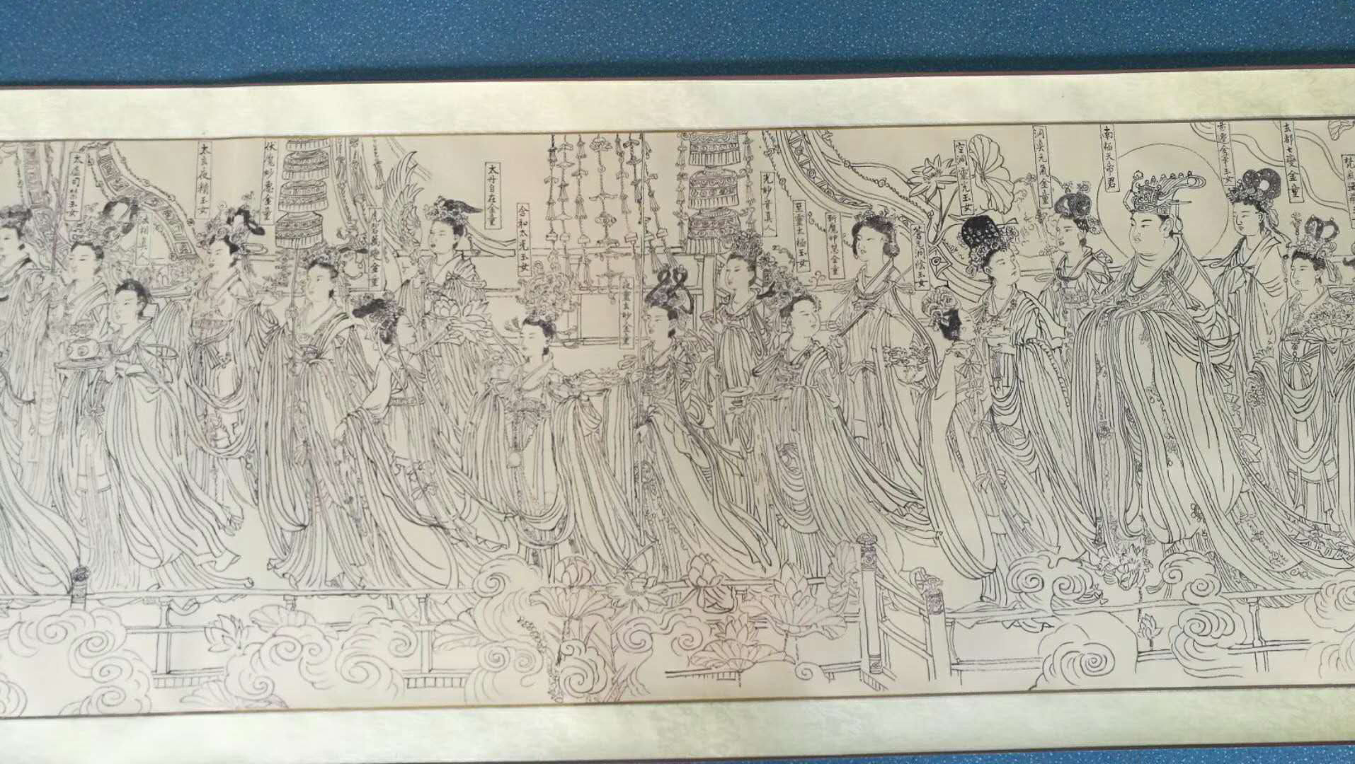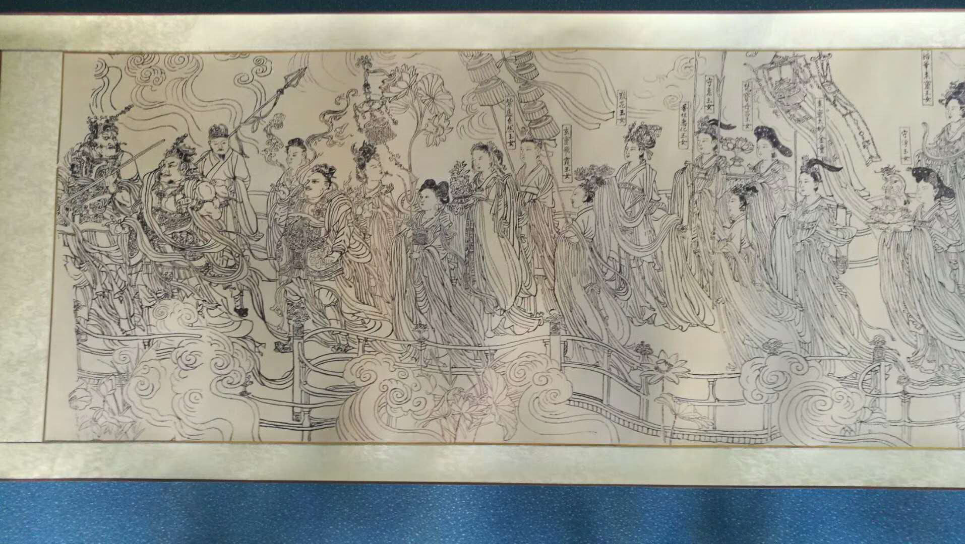 描绘的是道教中的三大帝君:南极天帝君,东华天帝君,扶桑天帝君率众仙真人神将及金童玉女,飘飘荡荡从天而降,列队前行朝谒元始天尊。画中的帝君神圣庄严,神将的凛然正气,仙女的风韵多姿,再配以亭台曲桥,祥云流水及幢幡流蘓和各种乐器,头饰,服饰共同组成了这幅和谐祥瑞,如梦如幻蔚为壮观的美丽画卷。